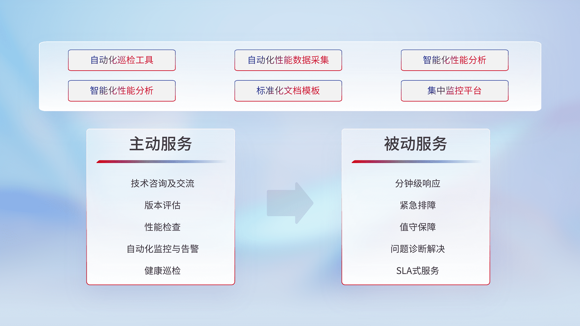 智能化工具和标准化文档,,,,保障服务质量,,,,提供主动服务(包含技术咨询、、、版本评估、、性能检查、、、、自动化监控与告警、、、、健康巡检)和被动服务包含(分钟级响应、、紧急排障、、、、值守保障、、问题诊断解决、、、SLA服务)。。。。