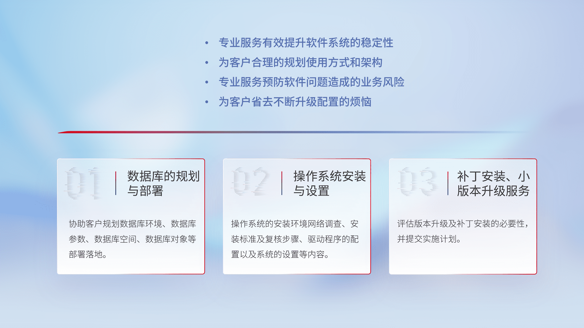 为客户提供软件规模升级、、快速部署、、按需配置的专业服务,,,从数据库的规划与部署到操作系统的安装与设置,,,,再到补丁安装和小版本升级提供支持。。
